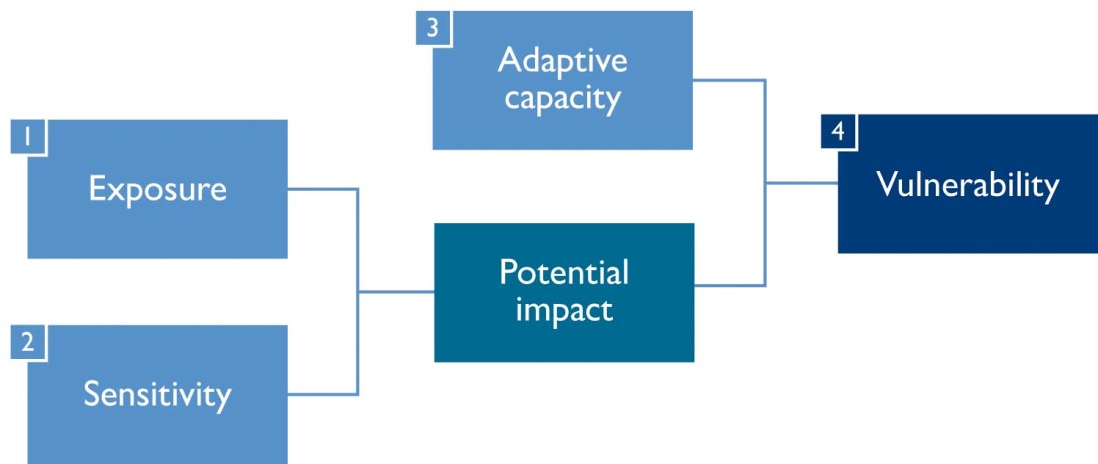 Vulnerability refers to the degree to which the Region is susceptible to changes in the climate and its potential impacts. The components of vulnerability include a combination of the following aspects – exposure, sensitivity and adaptive capacity, coupled with the potential impacts of a changing climate (refer to Figure 6).
